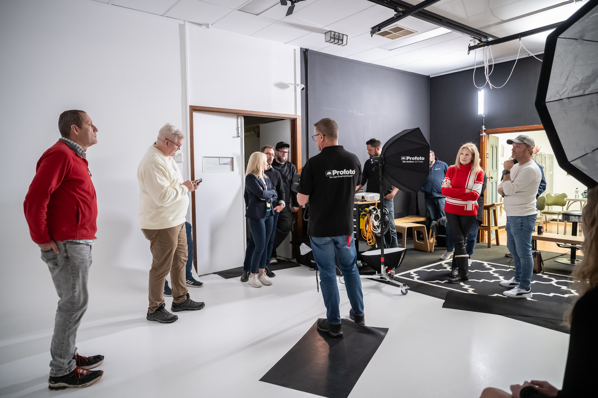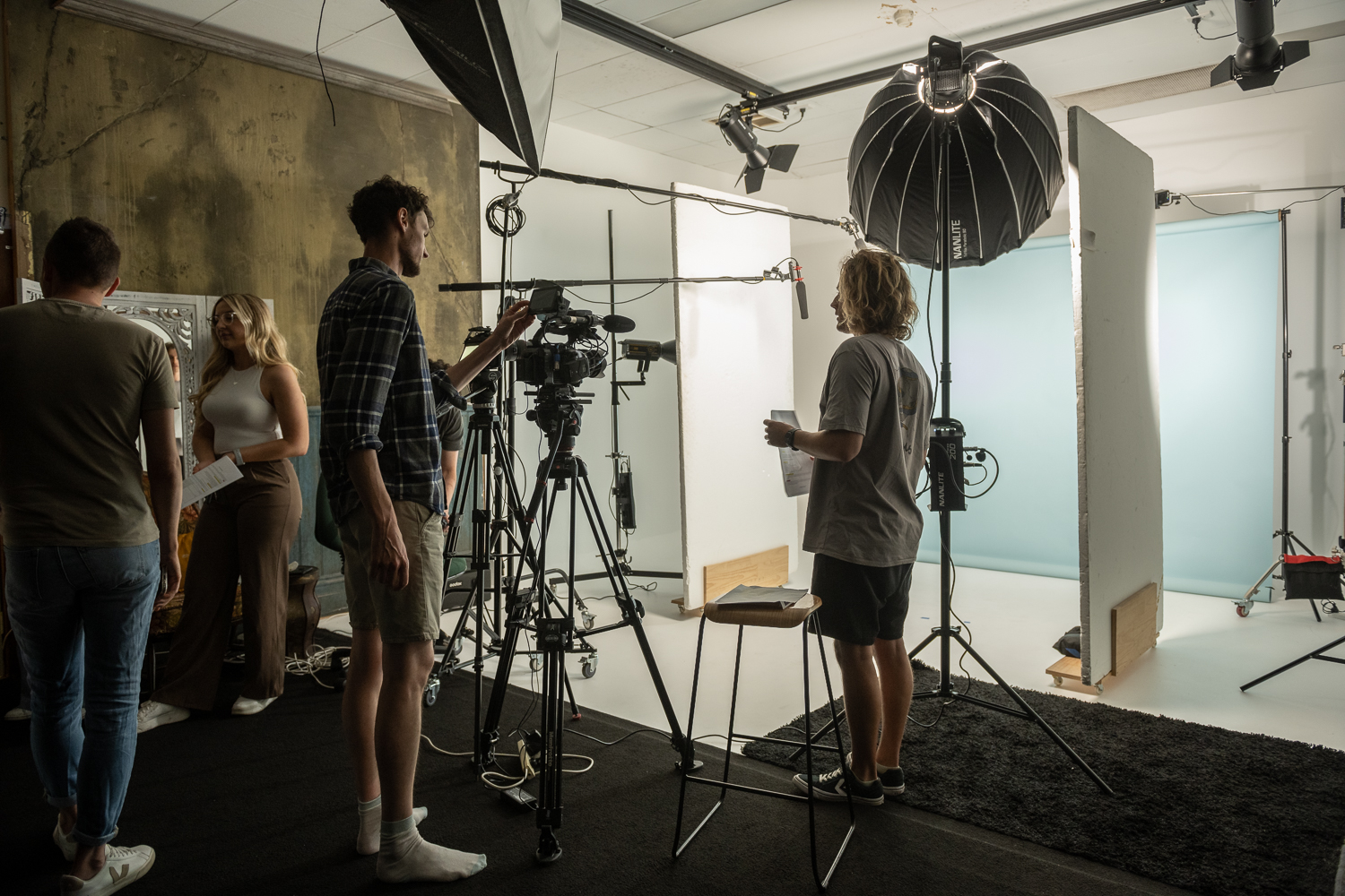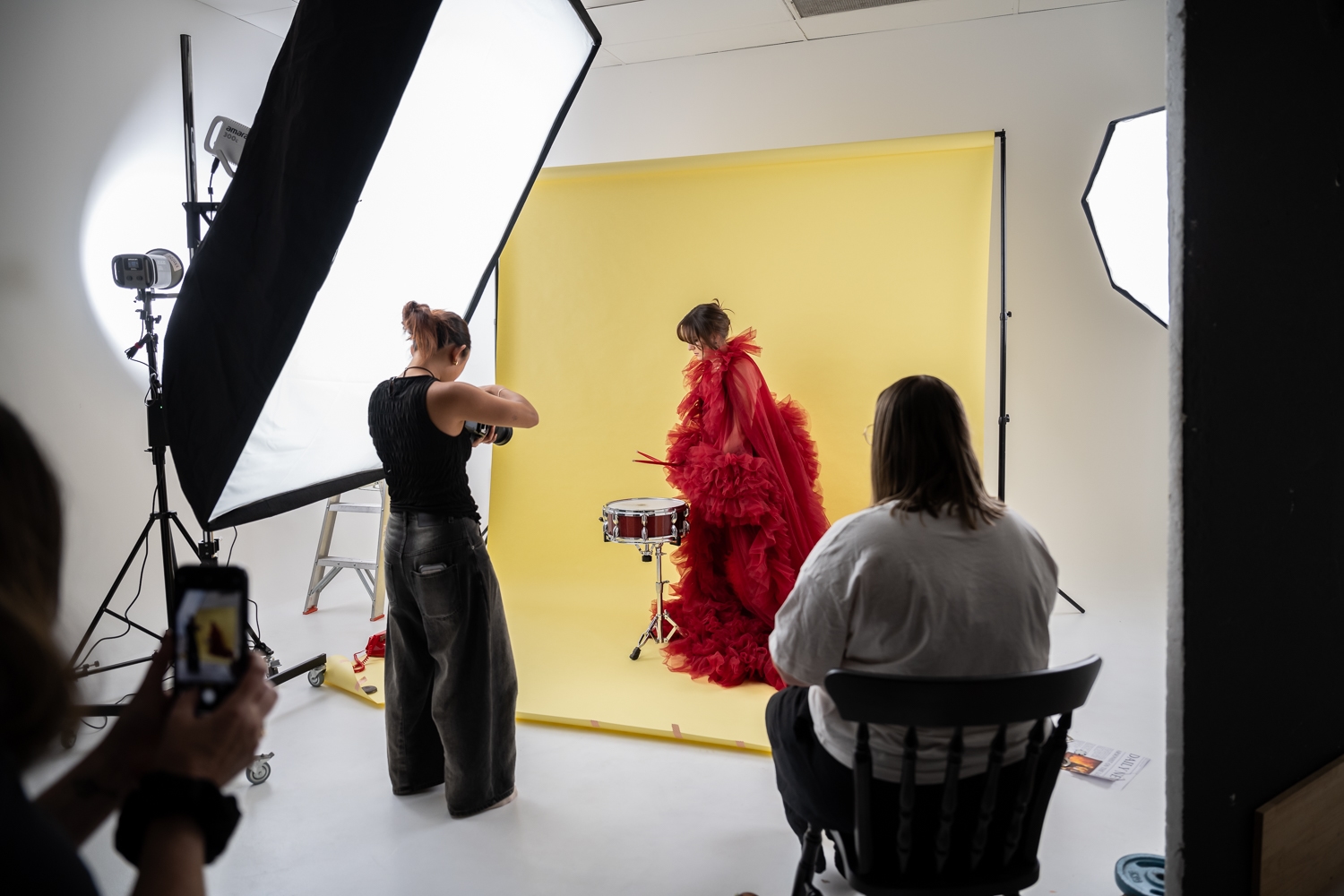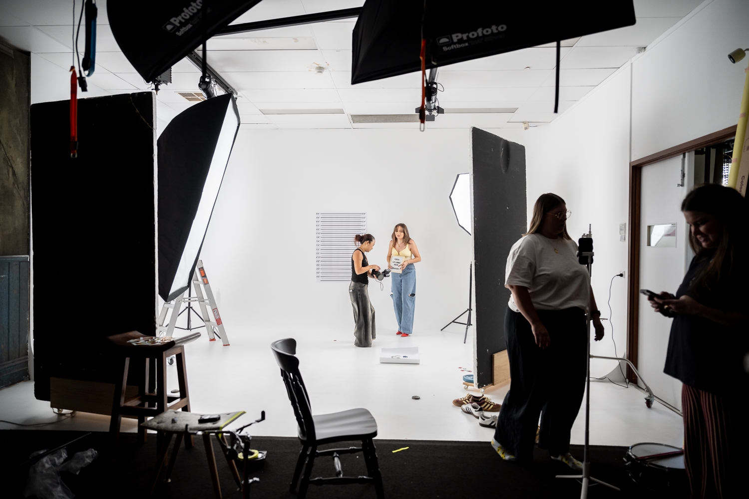 Ceiling-mounted lighting track, corner-to-corner cyclorama, a range of backgrounds and a sprung floor area are included in the space.
