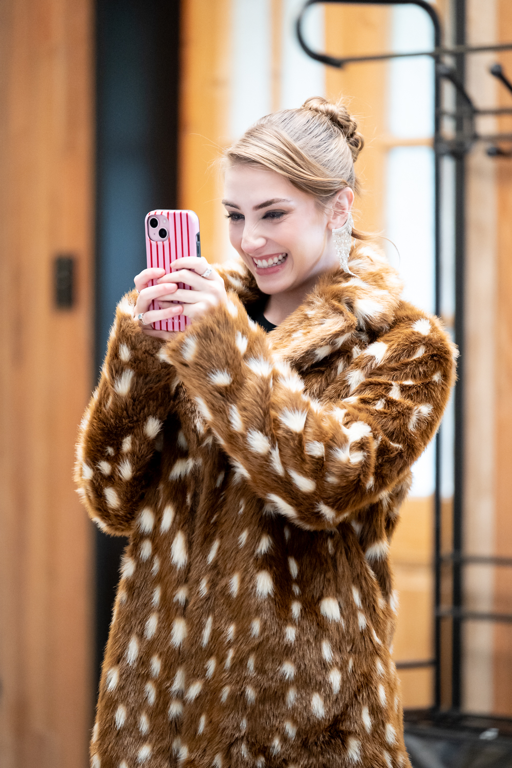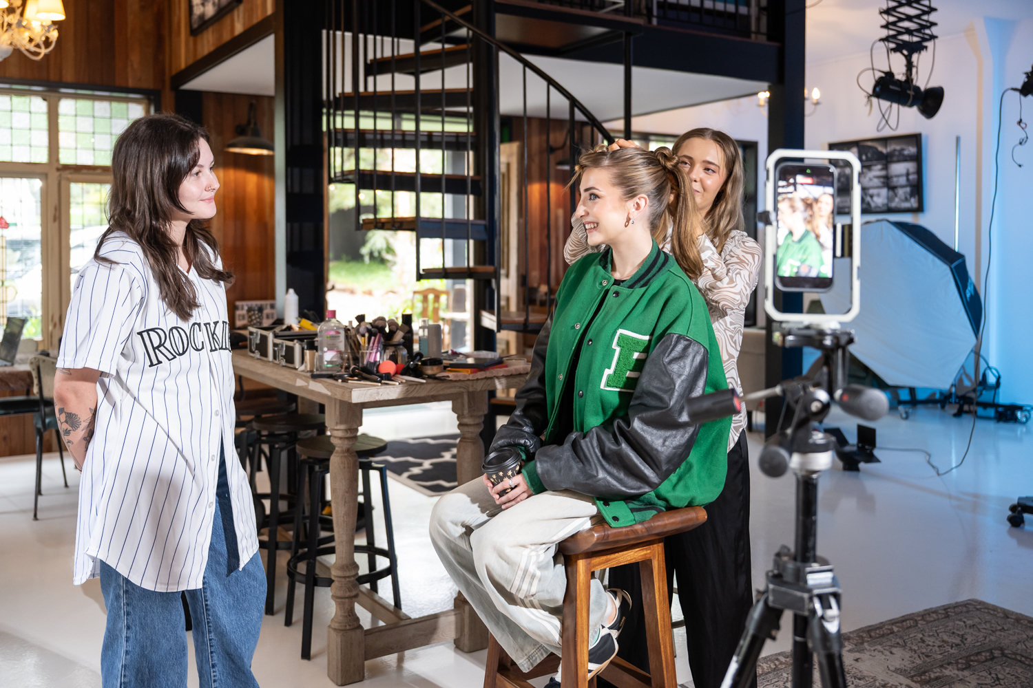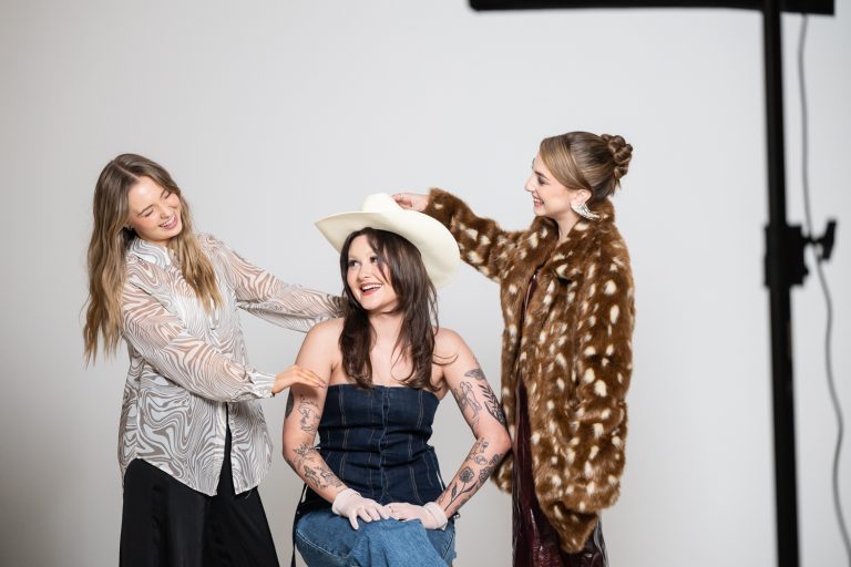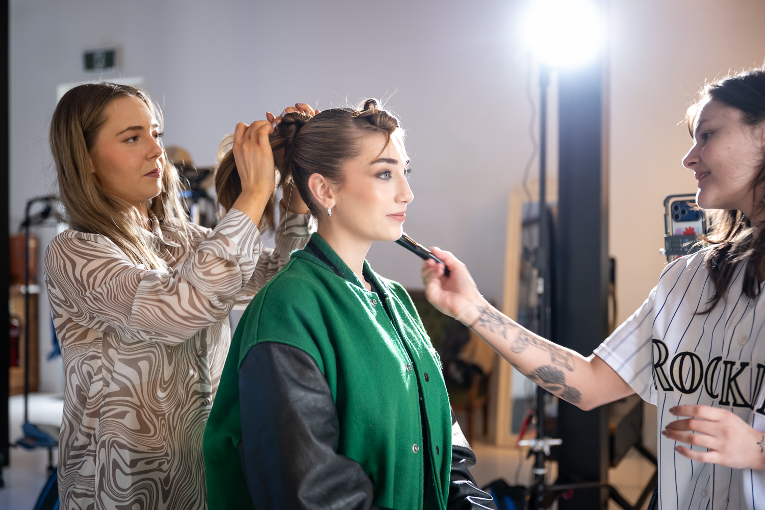 Lindsay explored some colour gels and camera movement with India for a creative start to the shoot, and then did a series of portraits of Emma. He ended up using some of our pop-up Lastolite textured backdrops (which he was expertly able to collapse – thanks Lindsay!) and shot Emma and Jade at various spots around the studio for more environmental shots. It was such a treat to watch this creative team in action!