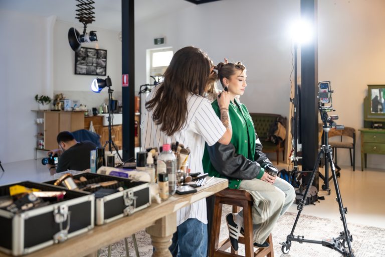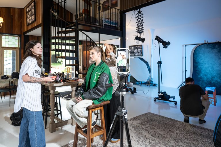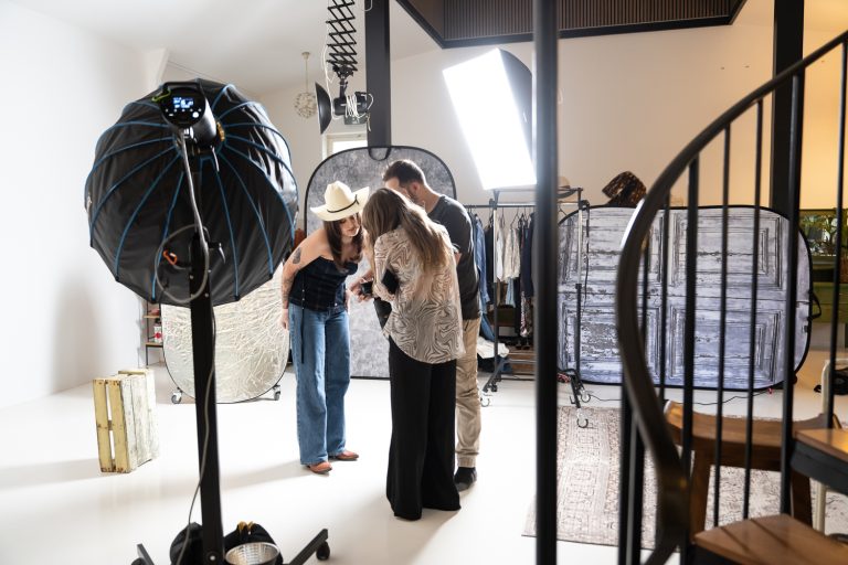 Lindsay explored some colour gels and camera movement with India for a creative start to the shoot, and then did a series of portraits of Emma. He ended up using some of our pop-up Lastolite textured backdrops (which he was expertly able to collapse – thanks Lindsay!) and shot Emma and Jade at various spots around the studio for more environmental shots. It was such a treat to watch this creative team in action!